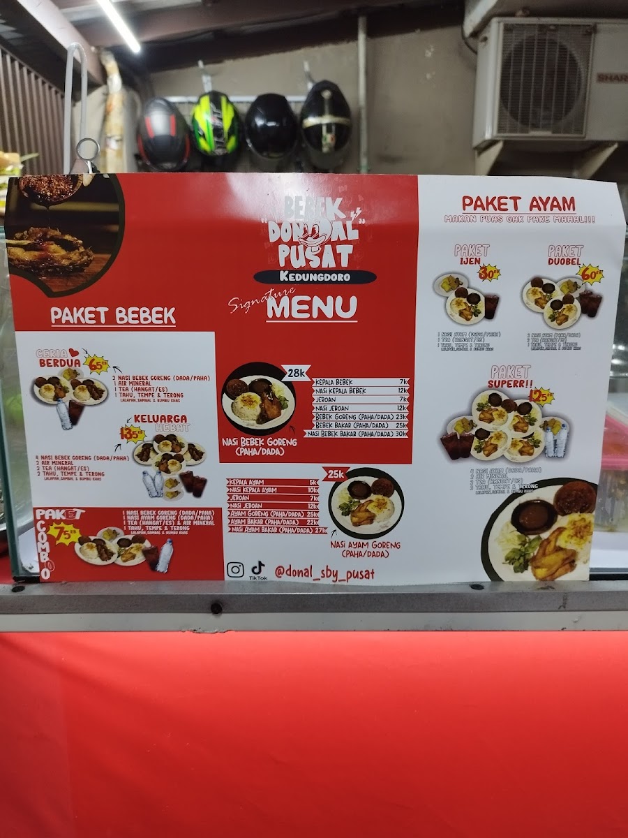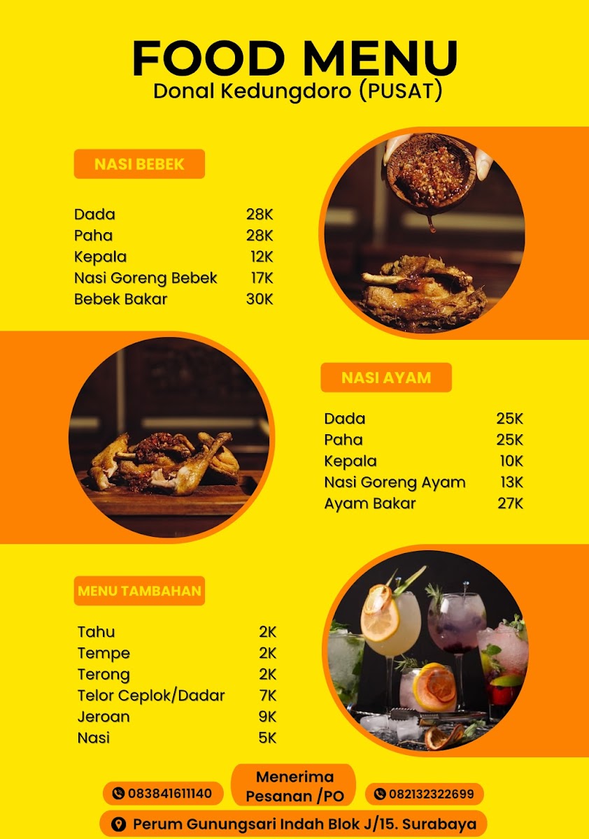 From a reviewer’s perspective, the menu at Bebek Donal Kedungdoro in Surabaya feels focused, confident, and true to its identity as a go-to spot for duck lovers. Rather than overwhelming diners with endless options, the restaurant refines its offerings around well-loved Indonesian staples, allowing quality and consistency to take center stage. The Nasi Bebek selection stands out as the heart of the menu, featuring satisfying choices like Bebek Paha, Bebek Dada, and Jeroan Goreng, each paired with rice to create a complete and comforting meal. For those who prefer a smoky, grilled flavor, the menu also highlights Nasi Dada Bebek Bakar and Nasi Paha Bebek Bakar, which add depth and variety through their richer aroma and taste. Complementing the duck dishes, the Ayam Goreng options-Paha Ayam and Dada Ayam-provide a familiar alternative that still fits seamlessly within the overall concept. As a whole, the menu reflects a clear understanding of its audience: simple, hearty dishes made to satisfy, without unnecessary complexity. This concise yet well-balanced lineup effectively summarizes what Bebek Donal Kedungdoro does best, leaving diners with a strong, memorable impression of a restaurant that knows its strengths and delivers them consistently.